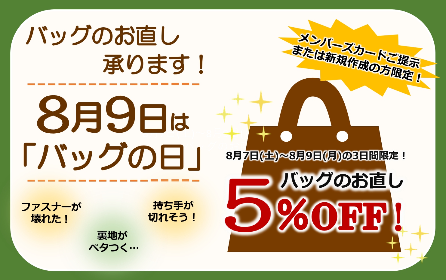 【メンバーズカードご提示または新規作成の方 バッグのお直し5%OFF!】