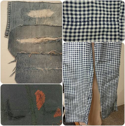薄くなった箇所、破れてしまった箇所の裏に布を貼り表から細かい針目でミシンをかけるとこの様になります!